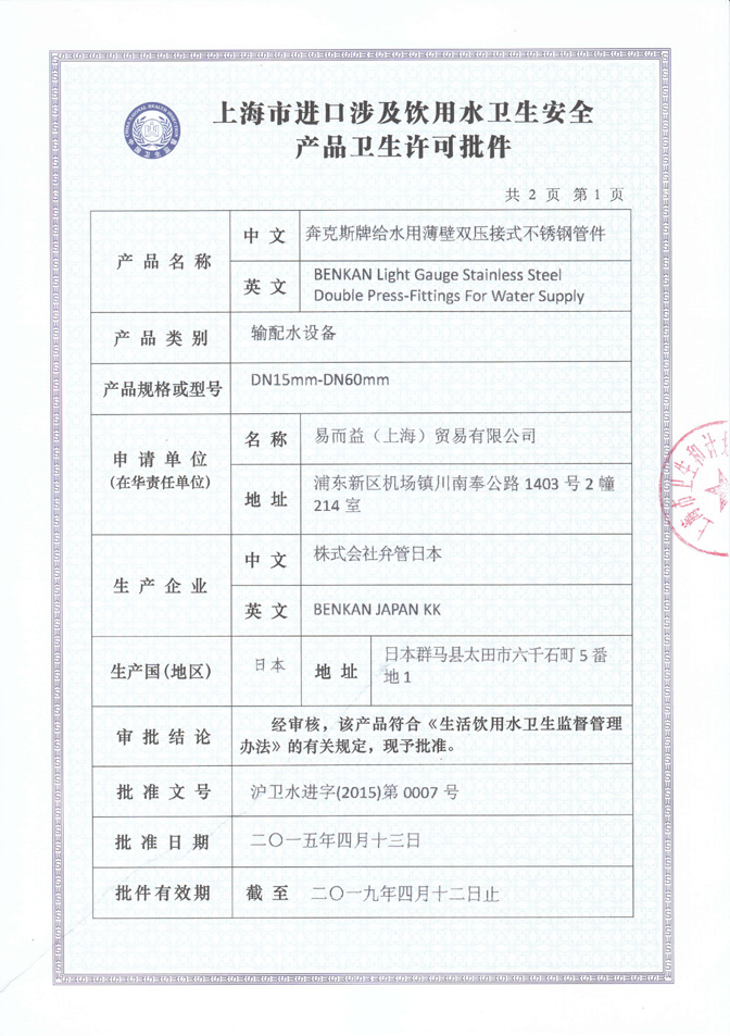 • 卡壓管件衛(wèi)生許可