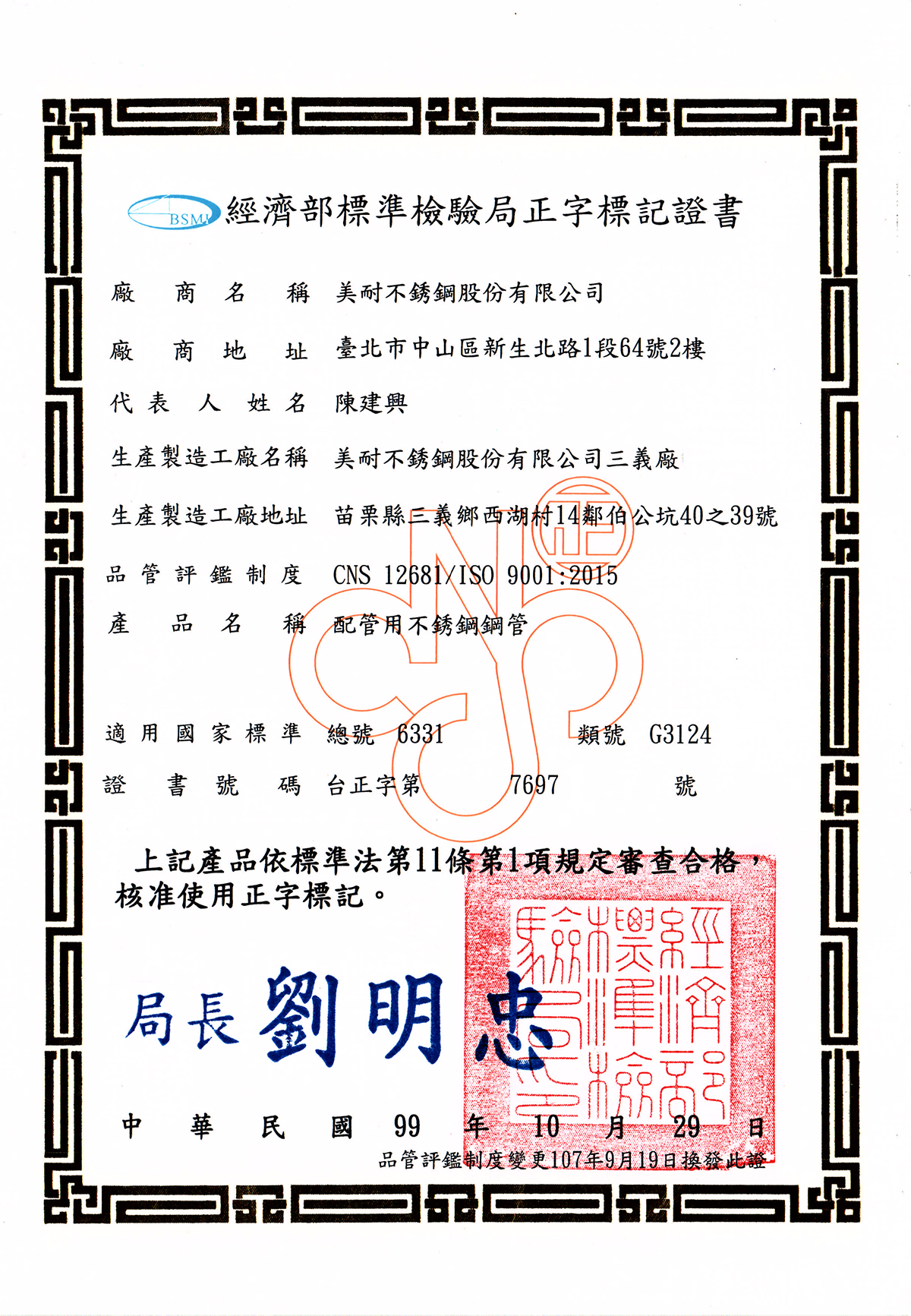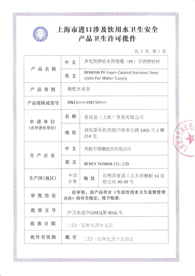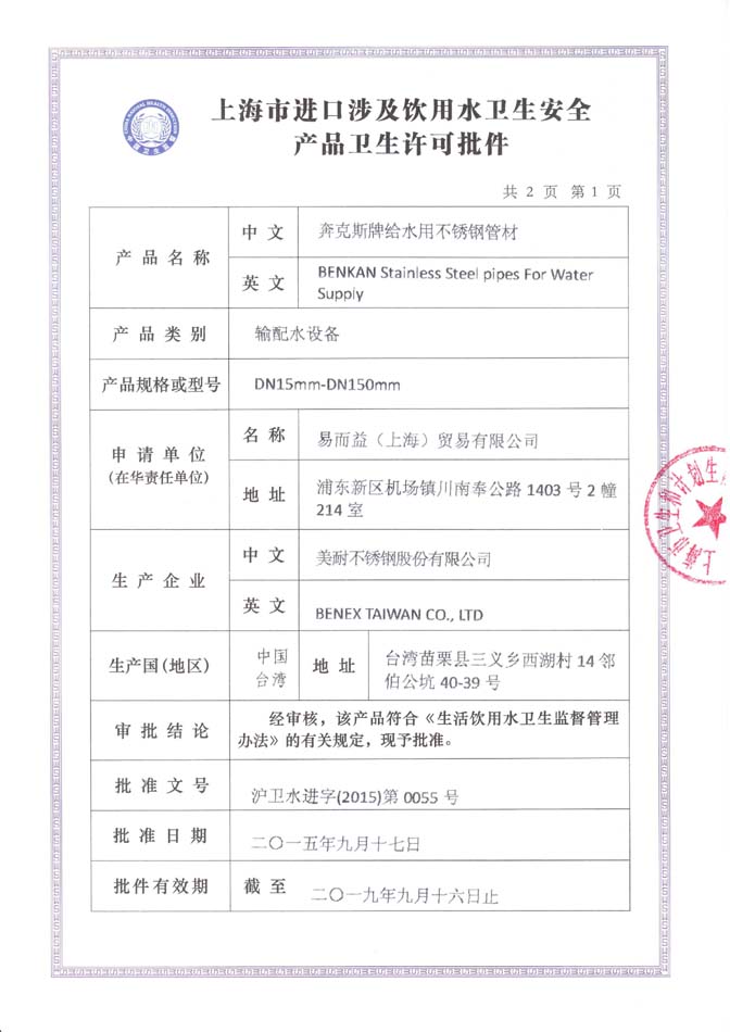 • 不銹鋼管材許可