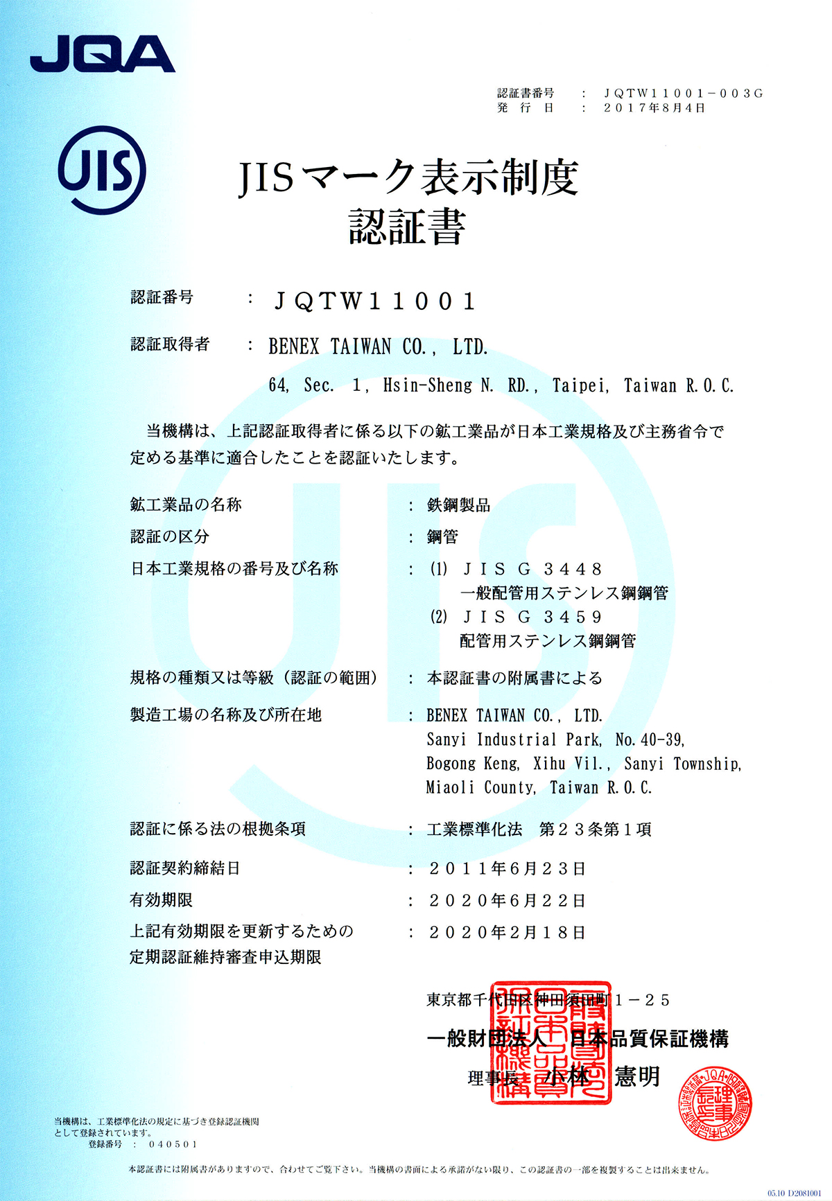 • JIS認(rèn)證證書